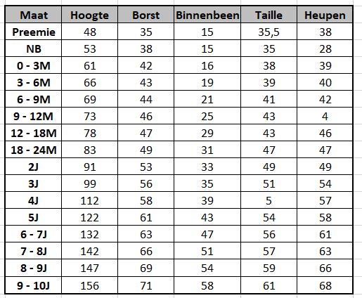 Low Land Kids is een Amerikaans patroonmerk en hanteert een andere maattabel dan de standaard die we in de winkels terugvind. Om zeker te zijn dat je de juiste maat neemt kan je op deze pagina enkele afmetingen nakijken.
